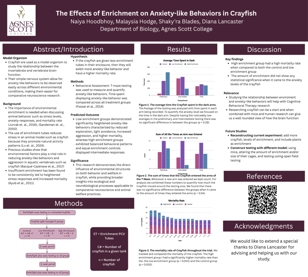 - Conducted a timed T-Maze test for crayfish when monitoring anxiety-like behaviors.